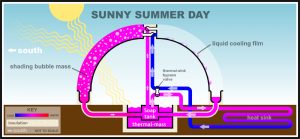 However, while the above image reveals its physical structure, it does not show the core of SolaRoof technology. For that matter, this single page is loaded with texts, pictures and videos, explaining how SolaRoof in PyraPOD works in mimicking the nature, that is the atmosphere around the earth, to create a zone suitable for plant growing or even for human habitat. If you cannot wait, take a look at the following diagrams showing how SolaRoof works. Video pages are also available for you to watch – use the top menu to pick your favorite category.