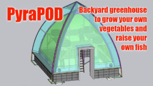 PyraPOD (meaning Fire in POD) is the embodiment of SolaRoof technology invented by Richard Nelson to create a series of POD shaped buildings. Shape and size can be different. PyraTENT and PyraPOD-4V17 are meant for backyard use, PyraFARM for farmers, with unlimited expansion potentials to produce fish, vegetables, mushrooms and other forms of food for an entire city!
