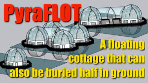 (8) PyraFLOT (P8W12f) is a house that can be built directly on water or buried half in the ground so that it can float up in a sustained flood. This is useful for those who live near the sea, the lake and in low grade areas that tend to have seasonal flooding. Two, four or more units can be joined together for expanded families or communities. Click to learn more about PyraFLOT.