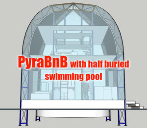 Half in ground and half above ground swimming pool is large enough to provide the thermal mass needed to store the massive solar thermal energy collected during the day. While PyraBnB paves the way for building all other residential houses, large or small, it also lays the foundation for PyraFLOT, which is built on water or half buried in ground.