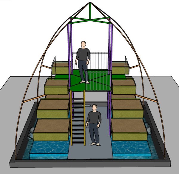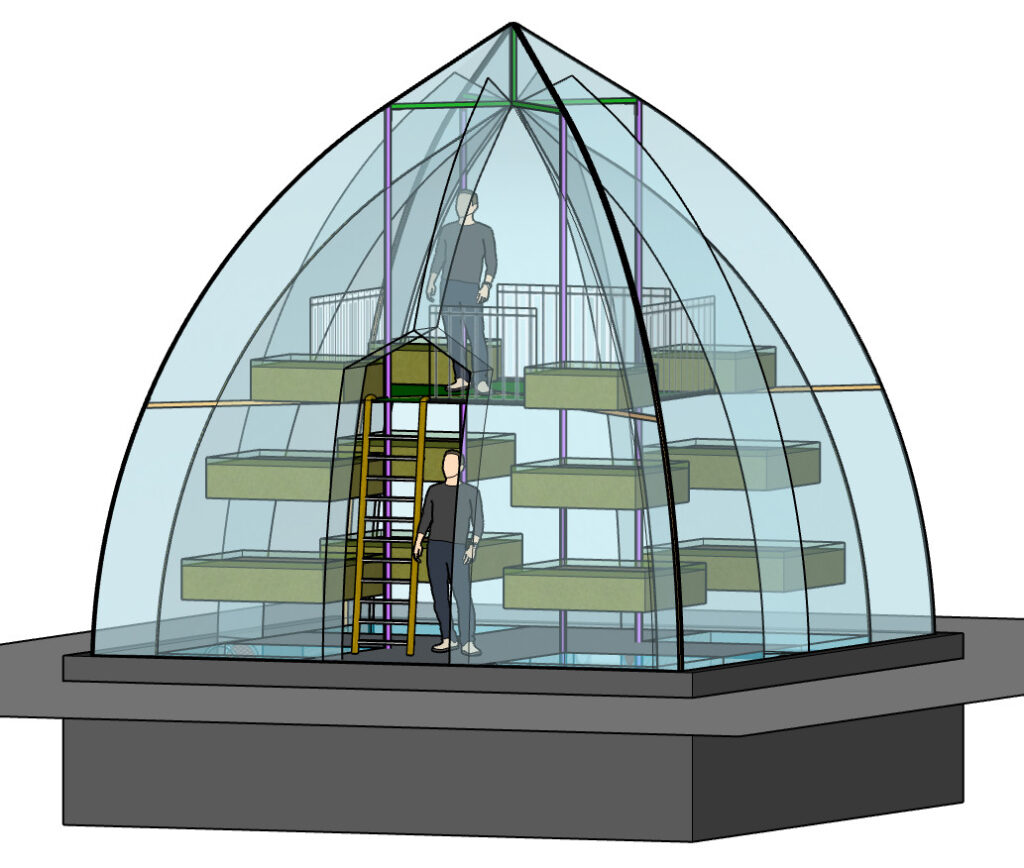 我们将在全球好几个地方建造金豆荚的前期样棚。下面是我们设计的最小金豆荚的三维图,显明其简单稳固的构架和双层覆膜系统,以及最有效的硅砂鱼菜共生立体种植系统。