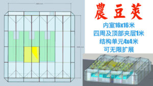 這是專門爲大型種養植的農場設計的,骨架全部採用直邊直麵的設計,製作容易,搭建簡單。唯一具有挑戰性的是雙層膜的縫製和如何使其與骨架銜接。與小型的種養屋相似,所有的魚池和沙床都是用兩面塗敷矽膠的軟膜製作的。