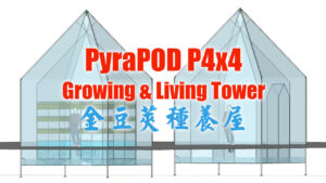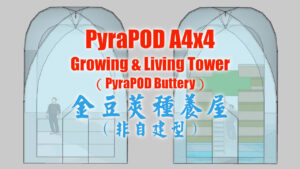 金荳莢種養屋的設計理唸,優先爲有自建能力的人考慮。爲大大增加整體的蓄熱能力,我們將馬可的“iAVS沙床魚菜共生”與理查德的“獨陽屋頂”整合在一起,設計了一個佔地僅4米見方、夾層0.5米厚的種養屋。其中自建版的代號是P4x4,頂部和立麵牆皆爲直邊直麵的,用最常用的管材、連接件和角材可快速搭建骨架。爲了便於剪裁透明膜,其上的金字塔由四個60度的等邊三角構成,其下的立麵牆是直角的長方。