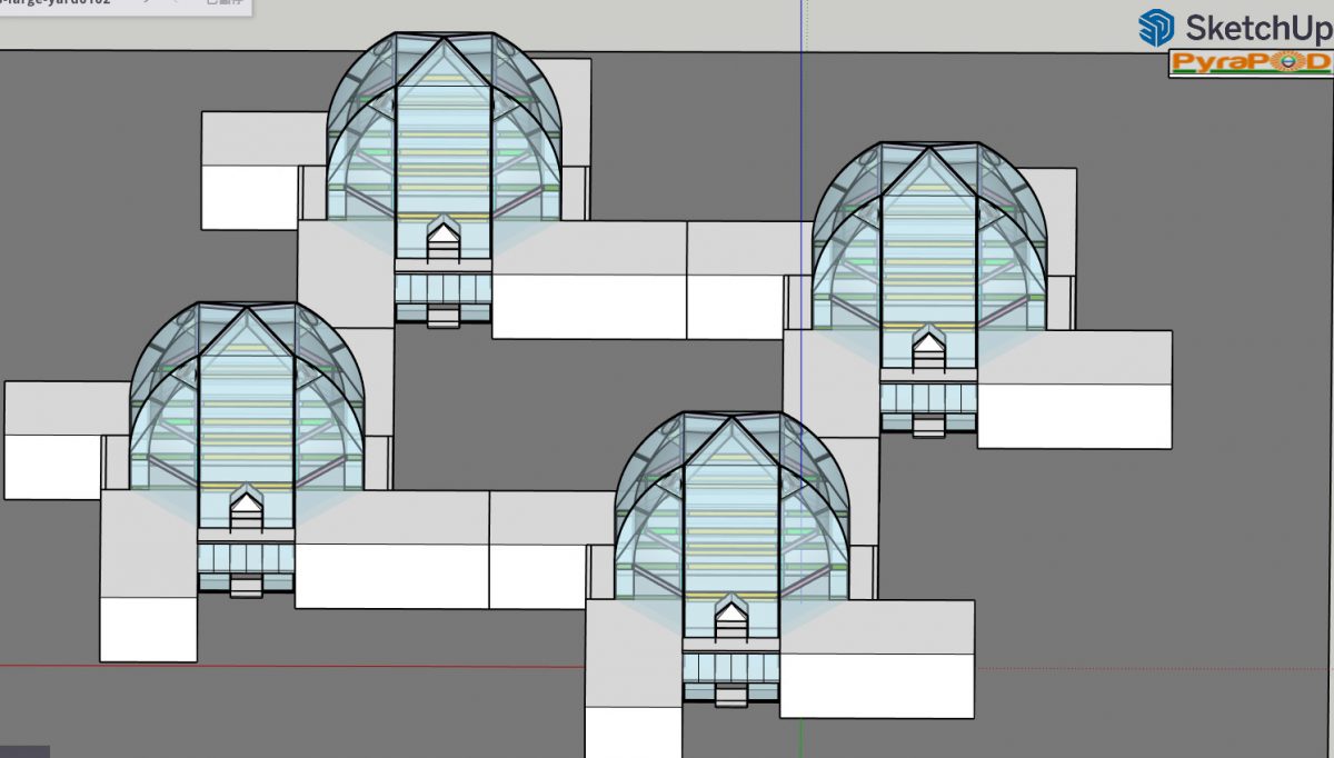 两个视频合成一个,前一部分展示对金豆荚4顶部斜梁和横梁的微调,后半部展示在金豆荚8的四个角嵌入可住人的方形建筑…